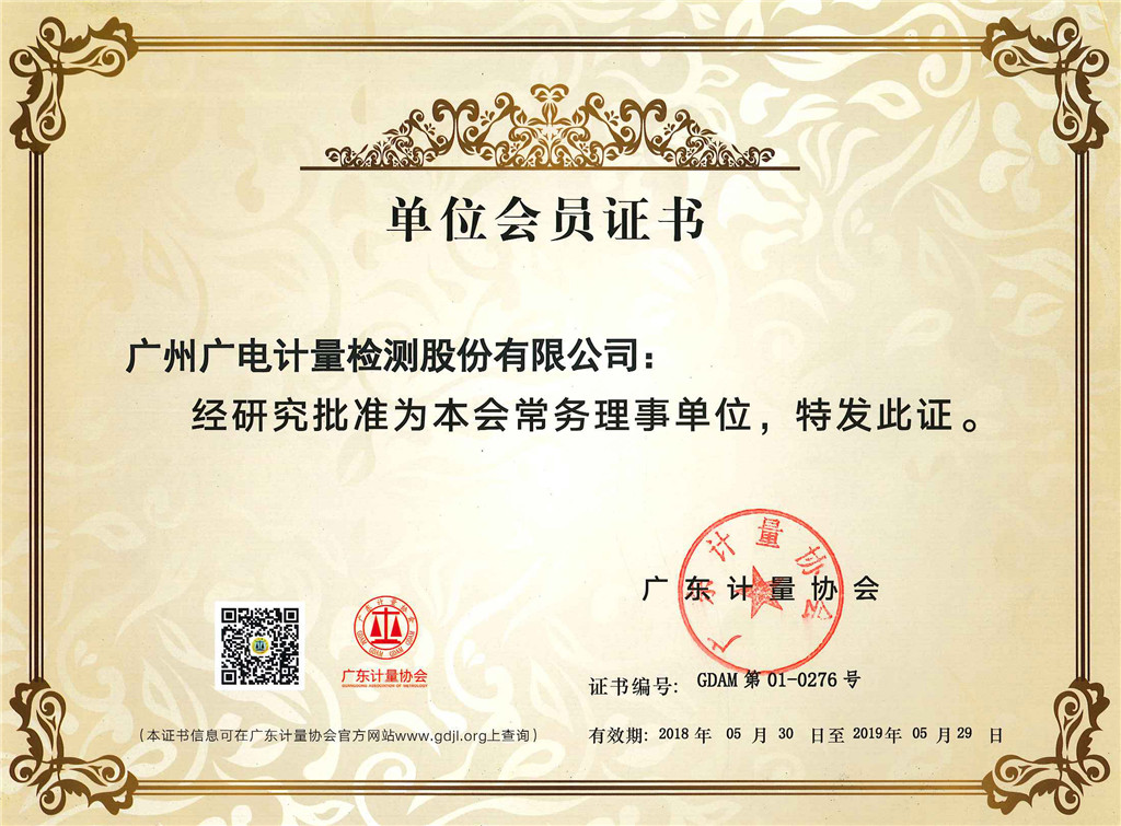 广东计量协会常务理事单位会员证书