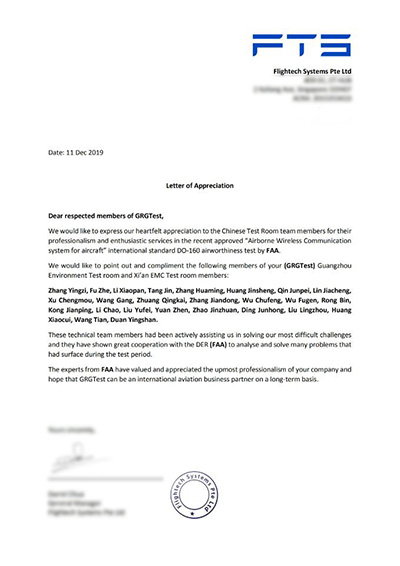 Entrusted by FTS (Beijing) Technologies Co., Ltd. (hereinafter referred to as FTS) and the Federal Aviation Administration (FAA) of the United States, GRG Test was responsible for the airworthiness certification test for DO-160G airborne satellite communication system. The company took advantage of national integrated management and control to deploy laboratory resources in Xi'an, Guangzhou and Shenzhen, so as to immediately establish the FAA airworthiness test project group, and set up the technical backbone team to prepare the test scheme for the full security.
