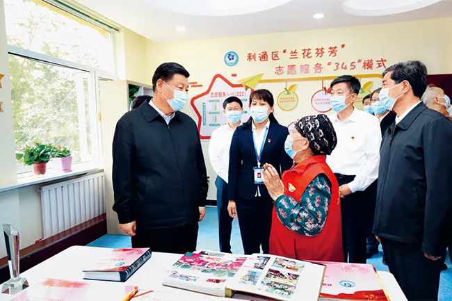 2020年6月8日至10日,中共中央总书记、国家主席、中央军委主席习近平在宁夏考察。这是6月8日下午,习近平在吴忠市利通区金花园社区党群活动服务中心,同社区志愿者代表亲切交谈。新华社记者 鞠鹏/摄