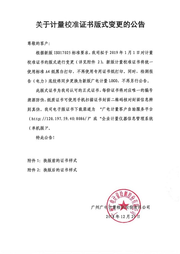 根据新版ISO17025标准要求,我司拟于2019年1月1日对计量校准证书的版式进行变更(详见附件2),新版计量校准证书将统一使用标准A4纸黑白打印,不再使用专用证书纸打印。同时,检测报告(电力)底纹将同步更换为新版开云LOGO,不再另行公告。
