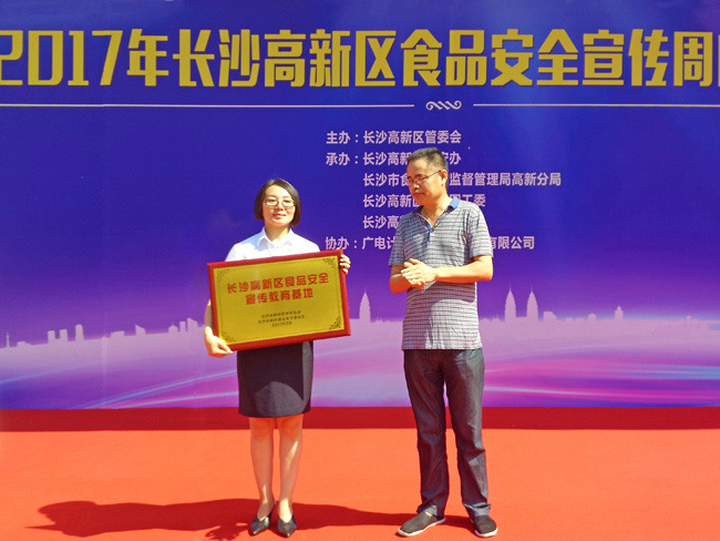 长沙高新区食安办副主任连正奇向开云授予“食品安全宣传教育基地”牌匾