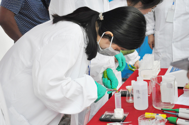 轮到市民王阿姨时,只见她从菜篮里拿出一根尖椒递给技术人员,技术人员立刻开始了检测——先把尖椒切碎放到三角瓶中,加入磷酸缓冲溶液,振荡,过滤……一系列熟练精准的操作看得大家连声称赞。最后把处理完的试剂放入农药残留检测仪,结果很快显现出来:抑制率小于50%,检测合格。