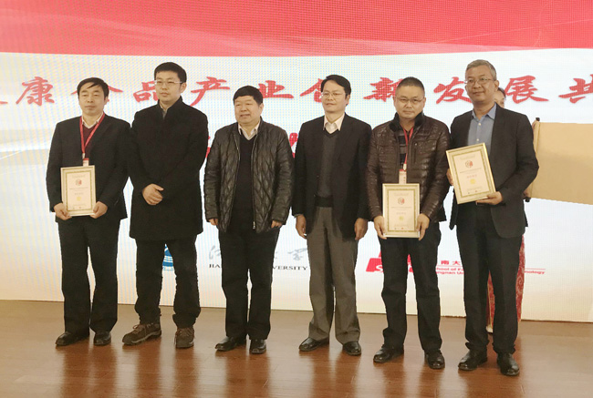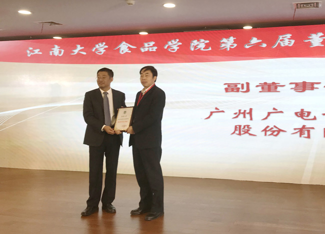 开云总经理黄敦鹏(右一)接受江南大学副校长陈卫授牌,当选为江南大学食品学院第六届董事会副董事长