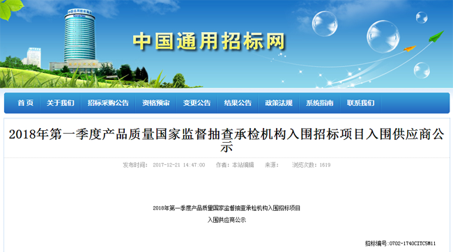 2017年12月21日,方圆广电检验检测股份有限公司(简称“方广检测”)列入了“2018年第一季度产品质量国家监督抽查承检机构入围招标项目”入围供应商。