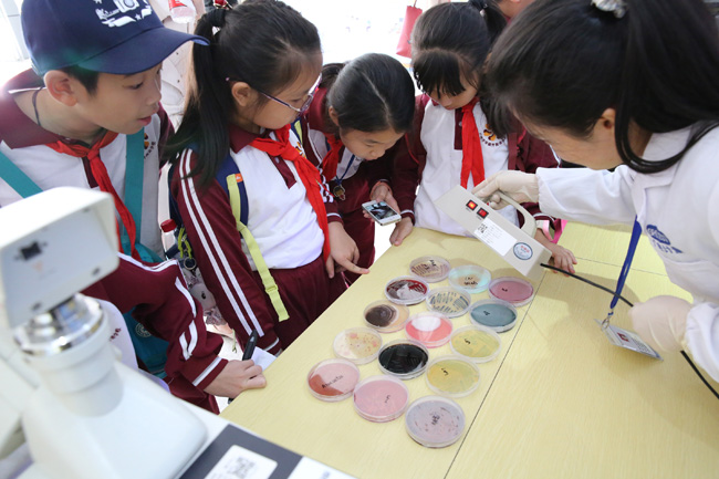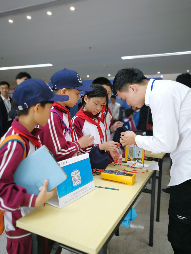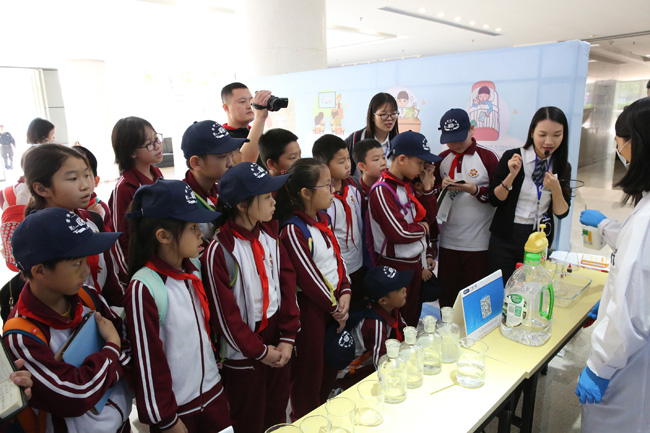 走进互动体验区,接地气的宣传展板和各种有趣好玩的小实验顿时吸引了小记者们的目光。瞬间变色实验、火山喷发实验、手机电磁辐射检测……孩子们目不转睛地盯着技术人员的操作,现场不时传出阵阵惊叹。