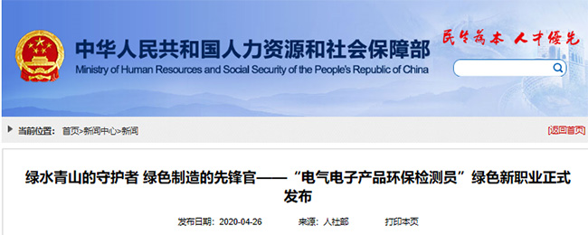 2020年 2月 25日,人社部,国家统计局,市场监督管理总局联合向社会发布了 16 个新职业。其中,“电气电子产品环保检测员”作为“绿色职业”被正式纳入国家职业分类目录。
