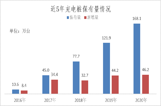 与此同时,近五年充电桩的保有量也在持续增长,截至2020年12月,全国公共充电桩和私人充电桩总计保有量为168.1万台,同比增长37.9%。其中,充电联盟成员单位的公共类充电桩约80.7万台,私有充电桩约87.4万台,产业发展迅速。