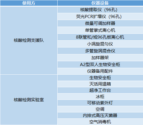 实施指南中“核酸检测支援队有关要求”和“核酸检测实验室储备及保障”条例中对实验室和检测设备的配备都做了明确要求,其中核酸检测支援队要求所需物资应当单独配备,各城市根据人口数量需配置不同规格的实验室并储备相关检测设备。