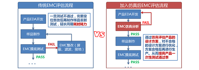 1) 对于传统的产品开发流程,大多是在样品设计及生产后,再依据相关测试标准对产品进行摸底测试和评估。一旦出现EMC不符合时,往往需要通过整改后再次制作样品并重新测试。