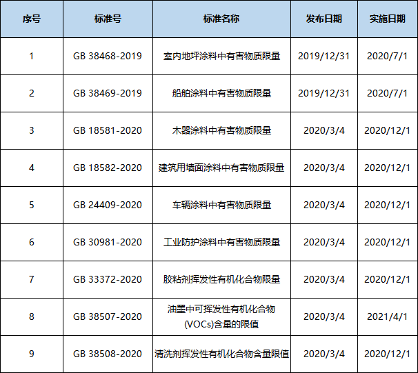 A:2020年3月7日,国标委公布由国家市场监督管理总局(国家标准化管理委员会)批准的《木器涂料中有害物质限量》等7项国家标准。2019年发布的GB 38468-2019《室内地坪涂料中有害物质限量》等2项国家标准,涉及四类分别是:涂料、胶粘剂、油墨以及清洗剂的标准。