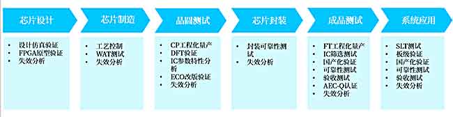 其中,仿真验证一般由芯片设计公司在tapeout前完成,WAT一般是芯片制造出厂前由foundry自行完成。Wafer out之后进入工程化量产或筛选测试阶段,CP、FT和SLT一般由第三方代工服务。期间伴随多样的测试技术也由第三方服务,包括验证分析技术、可靠性测试、失效分析技术和认证技术。