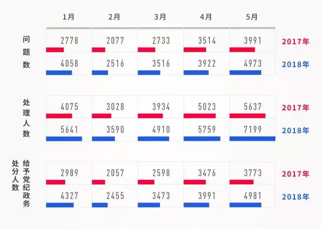 今年1-5月,每月的全国查处违反中央八项规定精神问题数、处理人数、给予党纪政务处分人数相比去年同期均大幅上升。