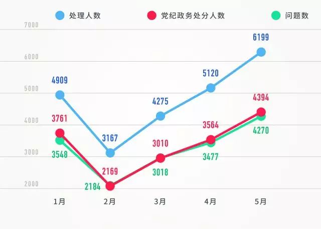 仔细梳理发现,今年1-5月,每月全国查处违反中央八项规定精神问题数、处理人数、给予党纪政务处分人数相比去年同期均大幅上升。此外,除2月有下降外,1-5月的各项数据呈逐月攀升趋势。