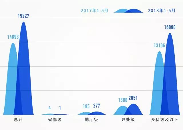 在给予党政纪处分人数中,除省部级干部人数降低了以外,地厅级、县处级、乡科级及以下人数相比同期均大幅提升。特别是,今年1-5月,给予乡科级及以下人员党纪政务处分达16898人,相比同期增长28.9%,且占到了处分总人数的87.9%。反映出全面从严治党不断向基层延伸,持续加大查处群众身边的“四风”和腐败问题力度。