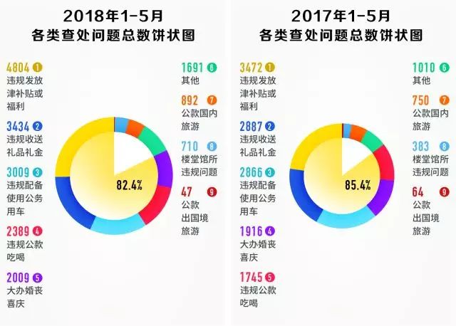 2017年、2018年1-5月各类查处问题总数饼状图,违规发放津补贴或福利、违规收送礼品礼金、违规配备使用公务用车、违规公款吃喝、大办婚丧喜庆等“老问题”占比较大,均超80%。